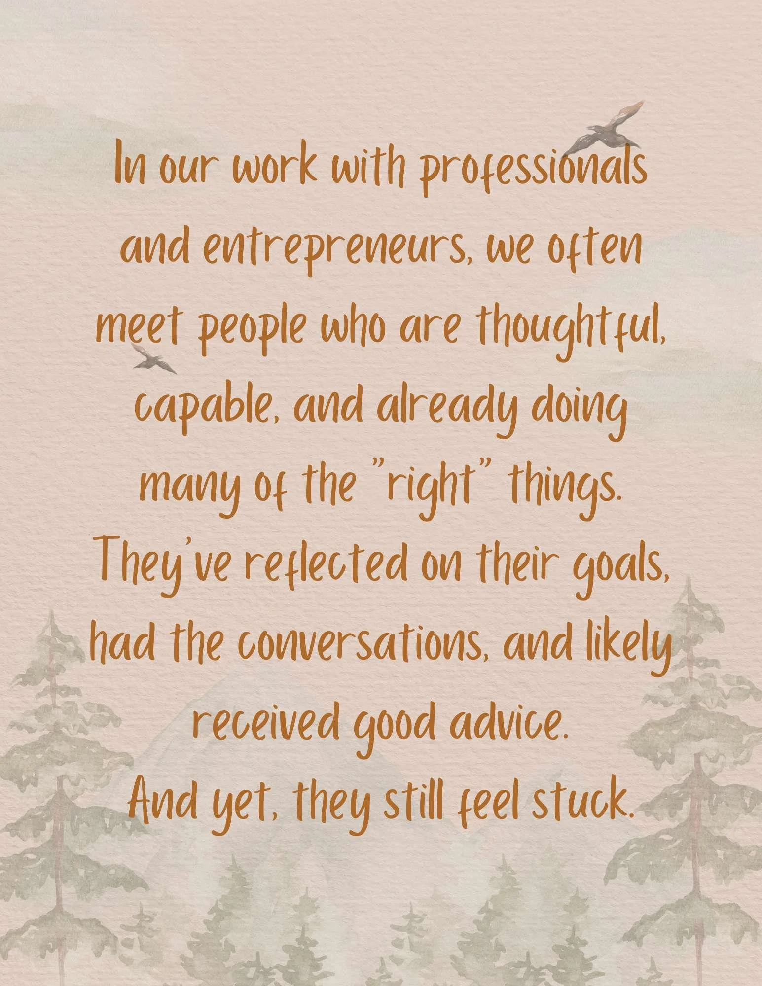 In our work with professionals and entrepreneurs, we often meet people who are thoughtful, capable, and already doing many of the “right” things. They’ve reflected on their goals, had the conversations, and likely received good advice.